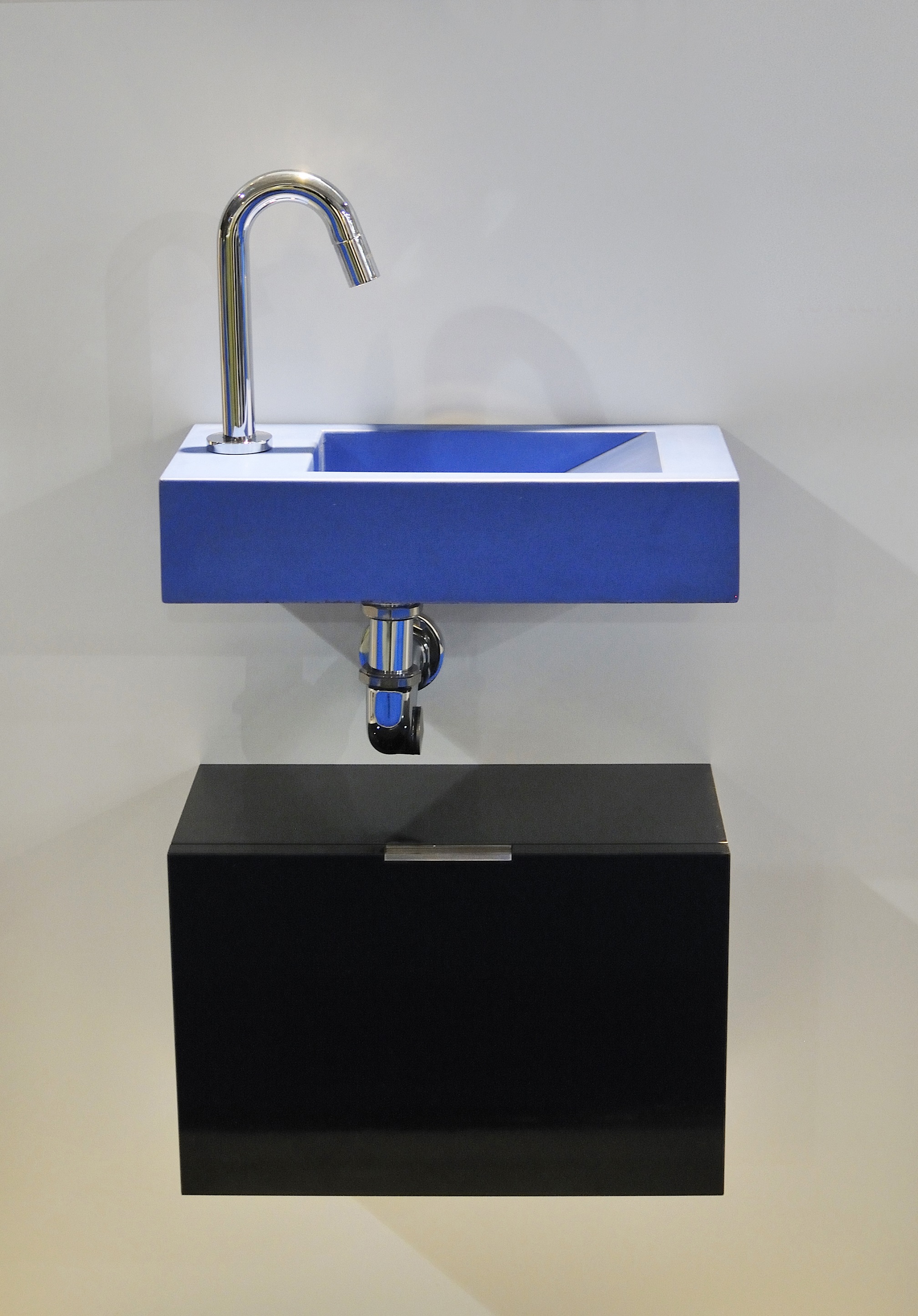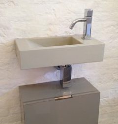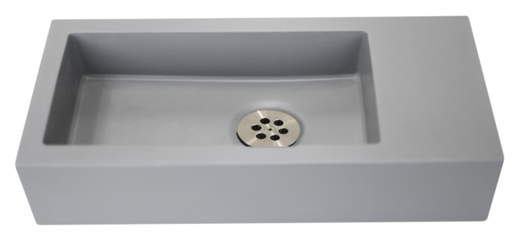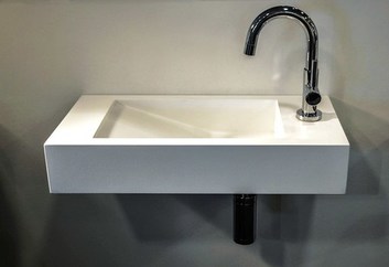 De Grado fontein heeft een rechthoekige kom, leverbaar met de kom links of rechts en in 2 maten.