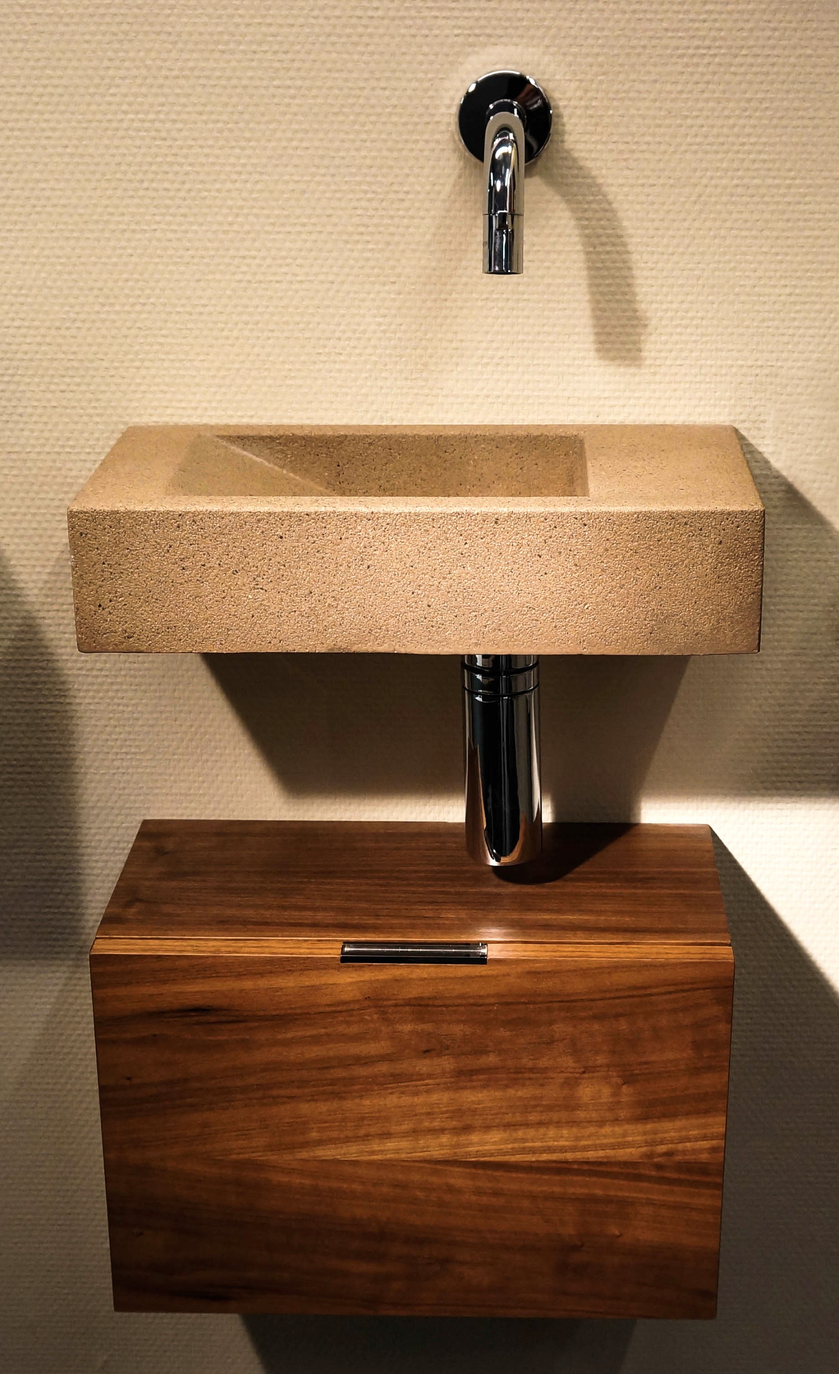 De Senza fontein is bijna vierkant en te plaatsen op een dragende ondergrond. Er is ook een fontein met hogere zijden verkrijgbaar, en een fontein met kraanstuk, deze zijn door middel van half verdekte beugels zwevend op te hangen.